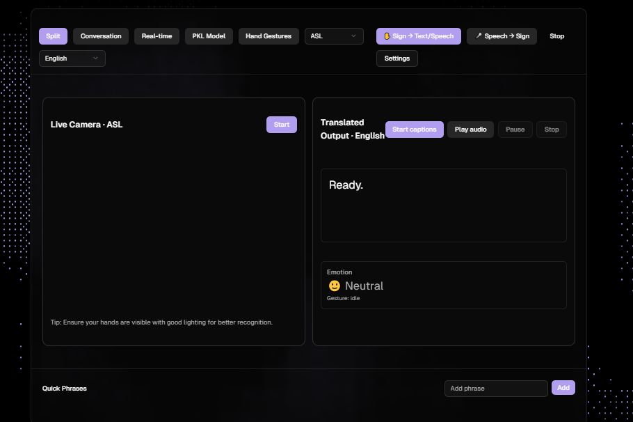 A full-stack application designed for low-latency, real-time translation of sign language gestures using machine learning models integrated with server-side endpoints.